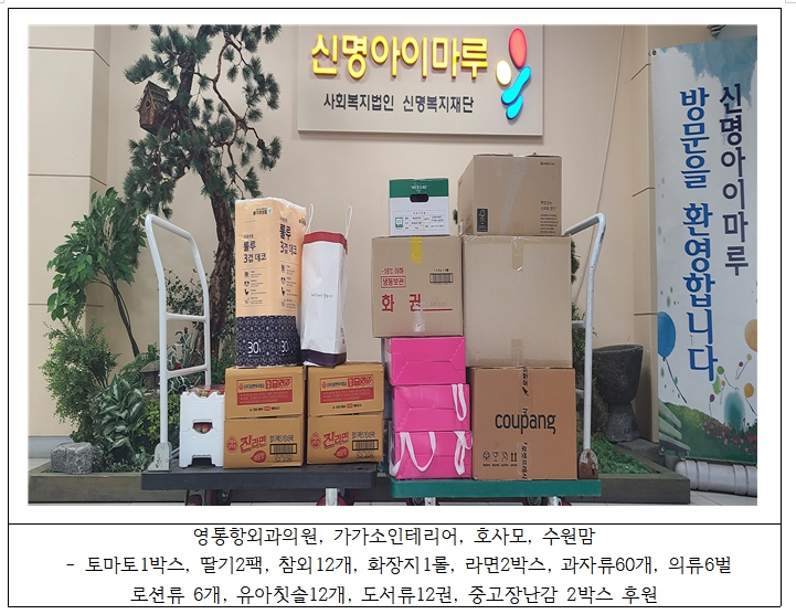 2025.05.09. ¿µÅëÇ׿ܰúÀÇ¿ø, °¡°¡¼ÒÀÎÅ׸®¾î, È£»ç¸ð, ¼ö¿ø¸¾¿¡¼­ °úÀÏ ¹× ½ÄÀÚÀç, °£½Ä, ÀÇ·ù ¹× »ýȰ¿ëǰ, µµ¼­·ù µîÀ» ÈÄ¿øÇØÁּ̽À´Ï´Ù.