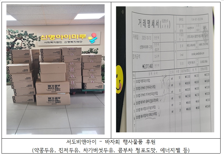 2025.10.14. ¼­µµºñ¾Ø¾ÆÀÌ¿¡¼­ ¹ÙÀÚȸ Çà»ç ¹°Ç° (¾àÄáµÎÀ¯, ÁøÀúµÎÀ¯, Â÷°¡¹ö¼¸µÎÀ¯, ÄÞºÎó ûÆ÷µµ¸À, ¿¡³ÊÁö Á© µîÀ» ÈÄ¿øÇØÁּ̽À´Ï´Ù.